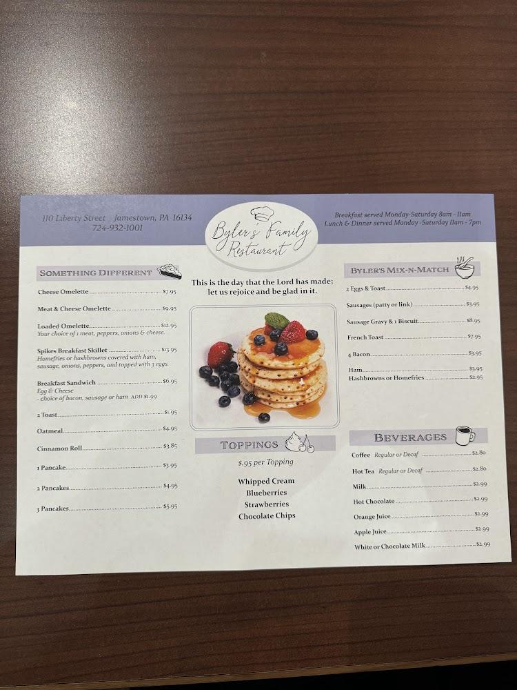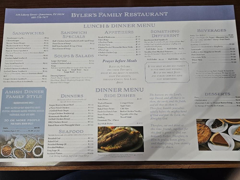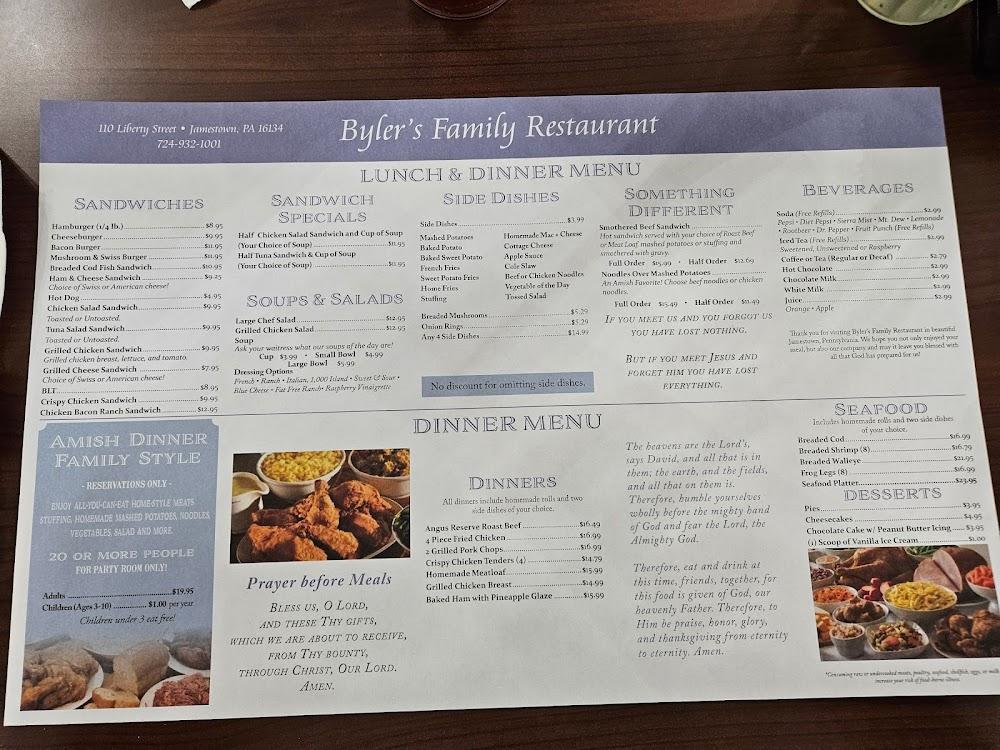 Welcome to Byler's Family Restaurant, where we serve authentic homemade Amish-style dinners in a warm, family-friendly atmosphere. Our menu features perfectly grilled steaks, hearty breakfasts, and mouthwatering desserts that keep our guests coming back for more. Located at 110 Liberty St, Jamestown, PA, we offer dine-in, takeout, and delivery options to suit your needs. With accessible seating and a cozy ambiance, it’s the perfect spot for families, groups, or a quiet meal alone. Whether you’re stopping by for brunch or dinner, we invite you to enjoy our delicious local specialties at affordable prices.